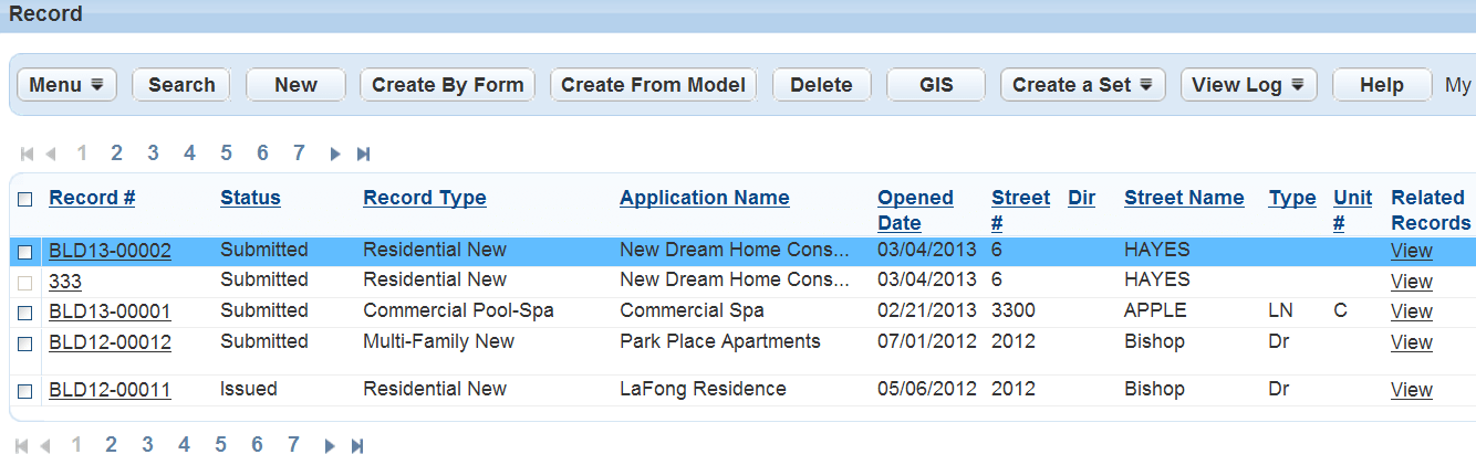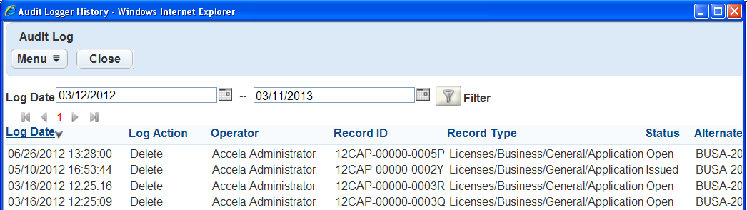 Table 1. Record List Audit Log Fields Alternate ID An identification other than the main identification, such as a parcel ID. Record ID The application identification number. Record Type The type of application, such as a Commercial or Residential Building Permit. Status The record status, such as Deleted.