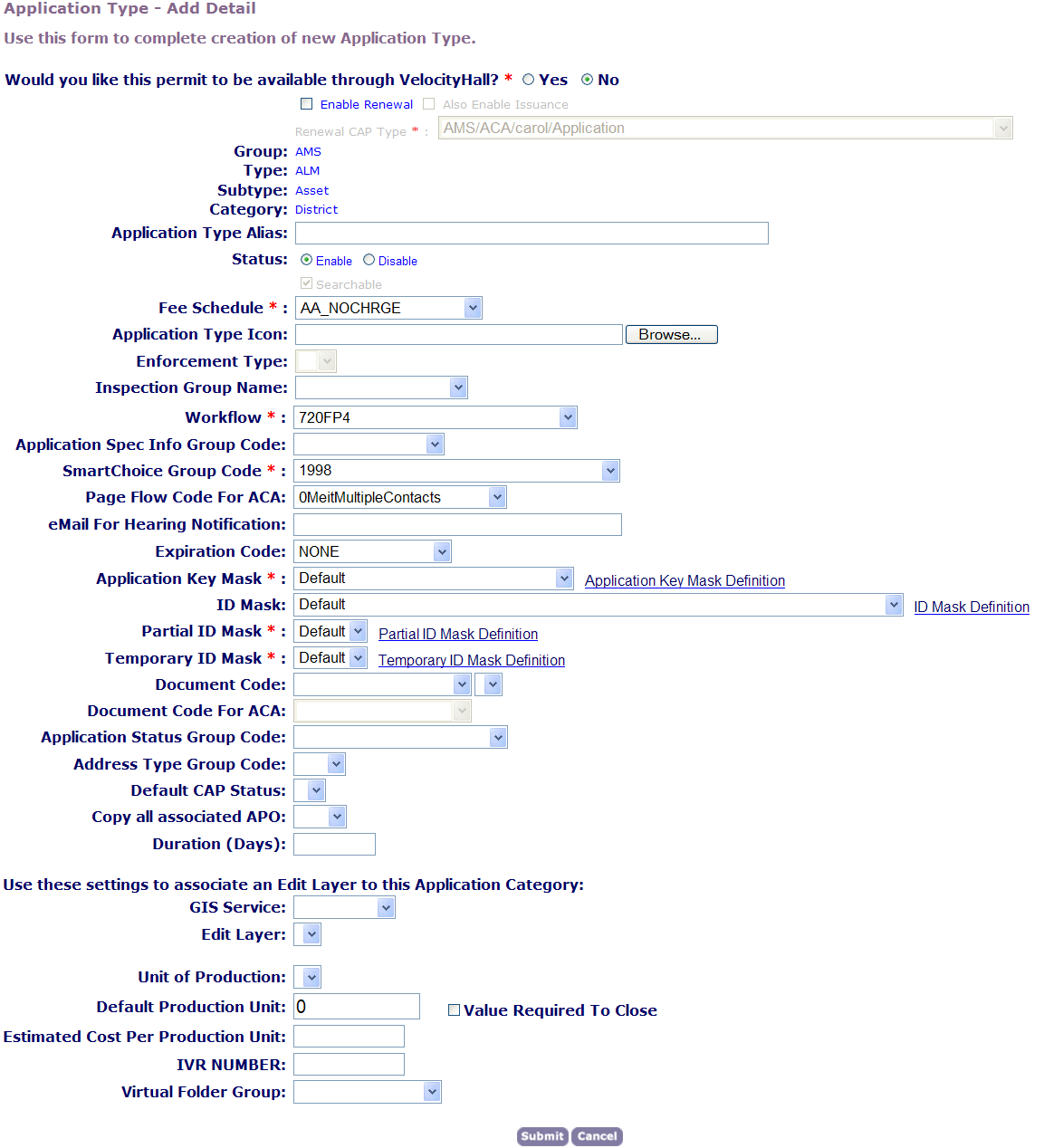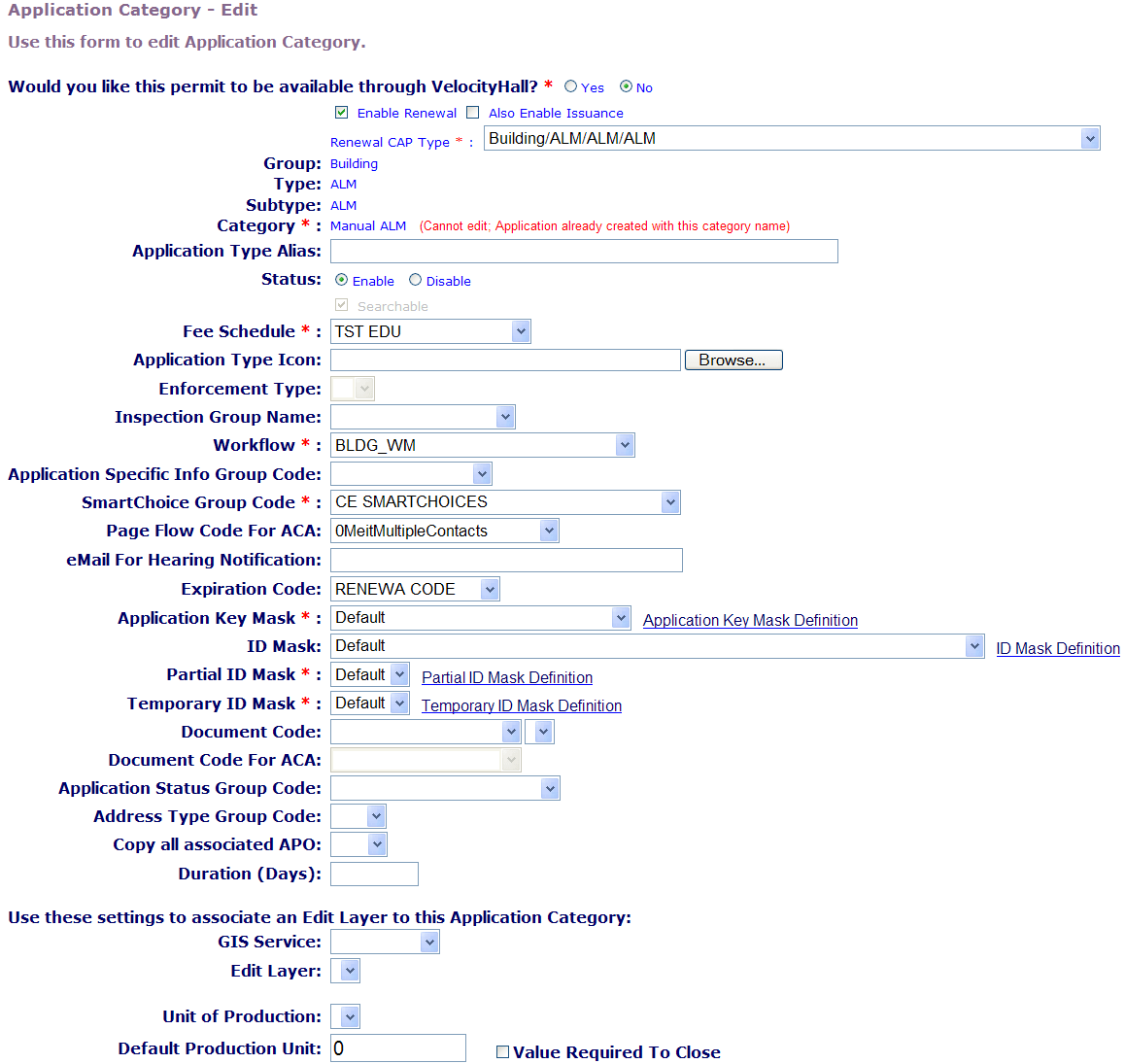 • Enable Application: Click this option to allow Citizen Access users to submit this type of application online.