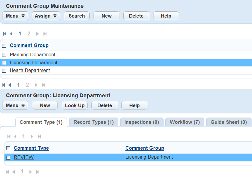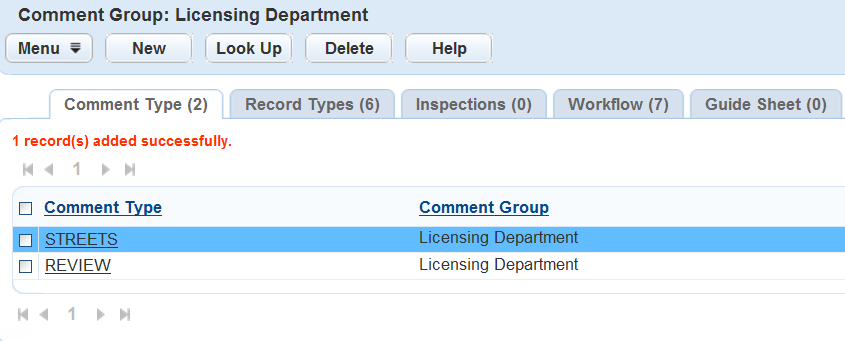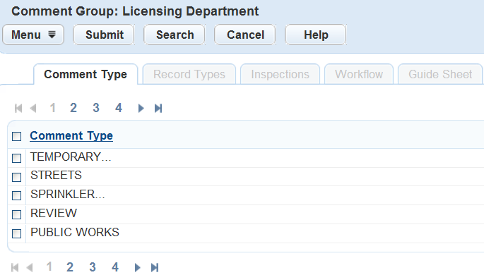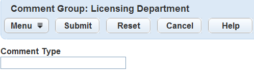 Comment Type Enter a name for the comment type. It is a good idea to select comment type names that correspond with the forms you use them for. For example, you could create Code Enforcement and Inspection comment types.