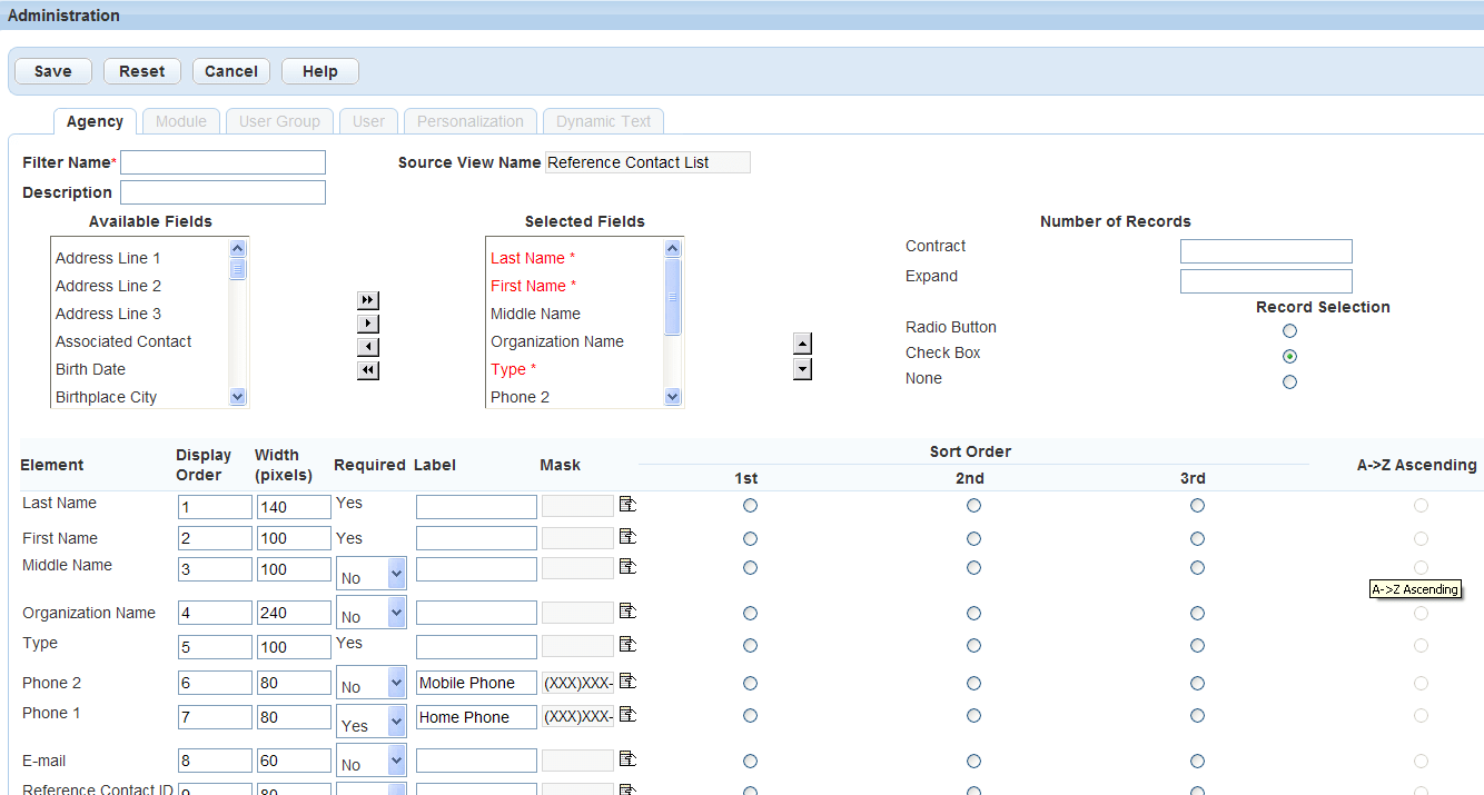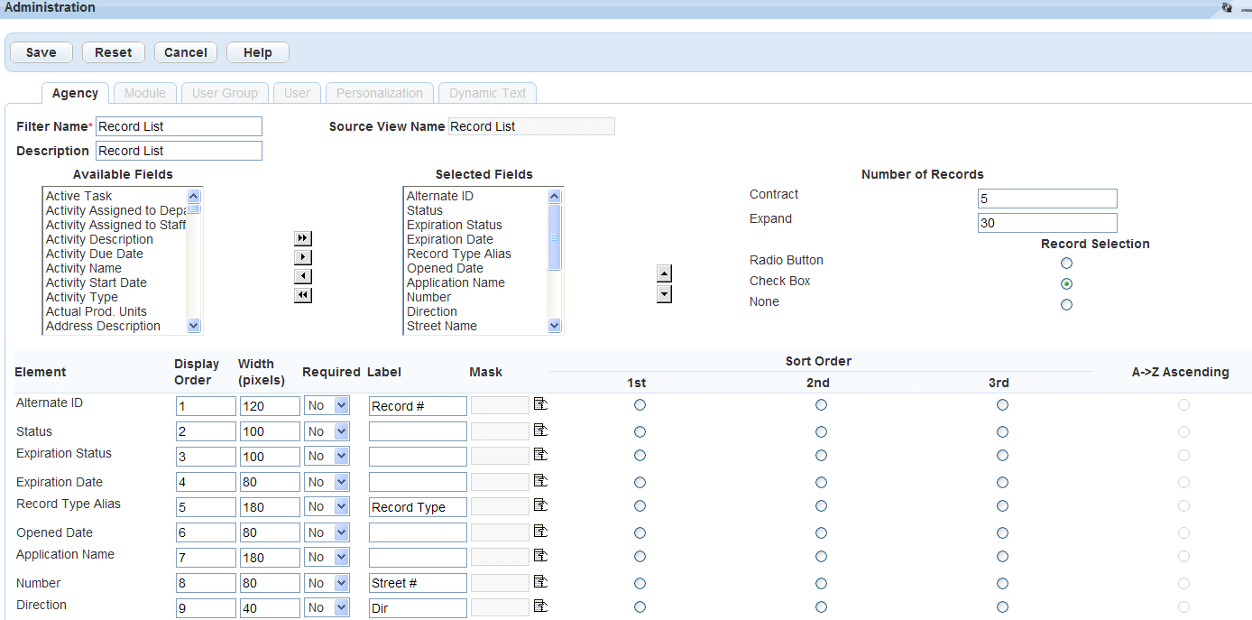 Table 1. List Layout Editor Details Available Fields Displays the fields that are available to use but are not currently displaying in the list portlet. To move any field to the Selected Fields box, highlight the field and click the right-arrow. To move all fields, click double arrow. Hold the CTRL key to select multiple fields. A > Z Ascending Select this option to further sort a selected sort order field in an ascending order alphabetically from A to Z. This option is the default setting and is available when you select a sort order for a field. Contract Enter the minimum number of items to display on one page of a list. Description Enter a description for the form. Display Order Specify the order for displaying each field on the form. Effect Scope Specify the availability of the customized sort/filter using the drop‑down feature for Module, Group, and User. Element Civic Platform lists the fields in the Selected Fields box in their current order. Expand Enter the maximum number of items to display on one page of a list. Filter Name Enter a descriptive name for the filter. Label If you want to customize the text label for a field, enter the new text label in the label field. Mask If you want to add a mask to the display of any field, click Mask to set up the mask. Number of Records The amount of records you want the user to see. The Contract option is the number of records displaying when a user contracts a list in a portlet and you have more than one portlet on your screen. The Expand field is the list of records shown when a user expands a list in one portlet. Record Selection Select the type of record selection icon you want to apply to the list. Civic Platform defaults to the Check Box record selection tool. If you do not want to allow users to select records, select None. Required Specify if you want to make the field mandatory. If you select Yes, a red asterisk displays on that field and a user cannot submit the form until that field has data entered in it. Selected Fields Displays the fields that currently display in the list portlet. To remove any field, highlight the field and click left-facing arrow. To move all fields, click double arrow. Hold the CTRL key to select multiple fields. To change the order, highlight a field and click up or down arrows.