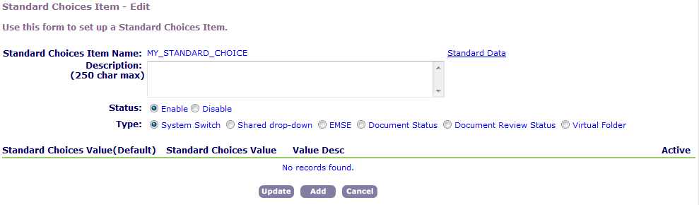 Standard Choices comprise a Standard Choice name, such as CONTACT_TYPE, along with Standard Choice Values and Value Descriptions. You specify Standard Choice Values and Value Descriptions to configure the operations controlled by the named Standard Choice (Standard Choice Configuration Screen).