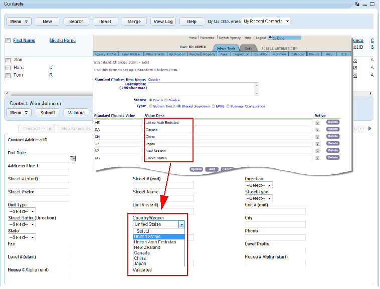 This Standard Choice defines a list of countries that can be available for selection in the Country/Region drop-down list across Civic Platform and Citizen Access. If your agency does not enable or define this Standard Choice, the Country/Region drop-down list displays the countries that the STANDARDDATA agency defines in the Standard Choice COUNTRY.