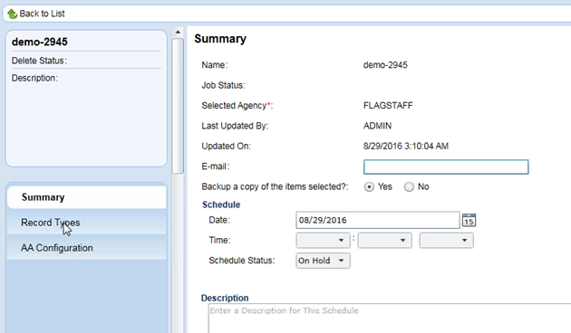 6. You have the option to schedule the delete job to run at a future time. Specify the day and time and then change the Schedule Status to Active to run the delete job at the specified time.