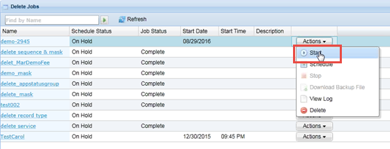 11. In the Delete Jobs panel, open the Actions menu and click Start and then confirm that you want to start the delete job.