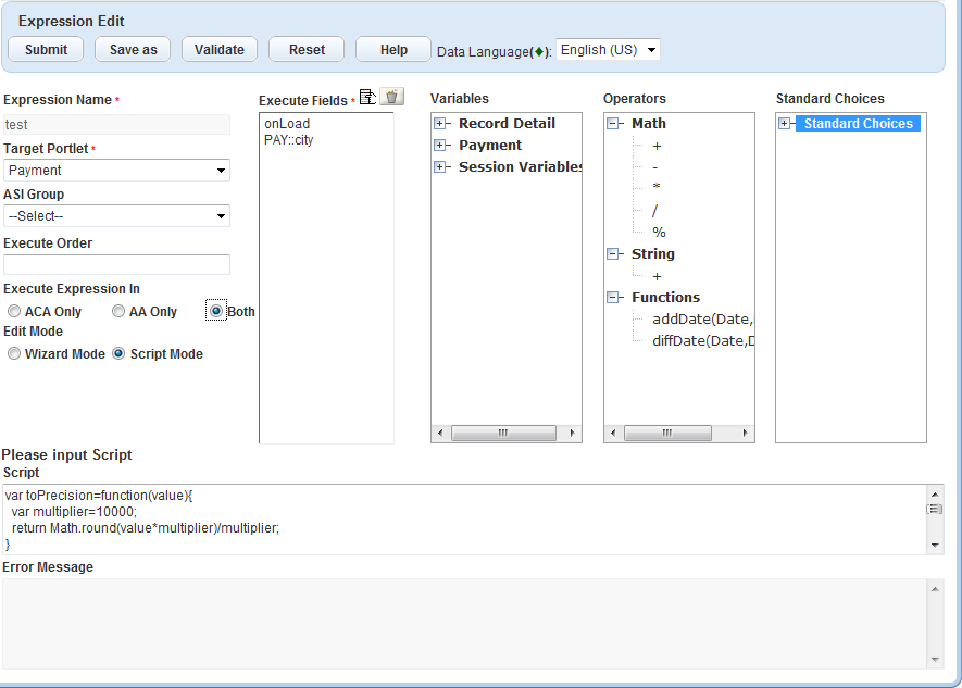 Expression Builder provides a wizard to create expressions (see Civic Platform Administrator’s Guide) and Civic Platform generates scripts to implement the expressions that you create through the wizard. You can view and edit the generated expression scripts in an Expression Builder window when you toggle Expression Builder from wizard mode to script mode (Expression Builder Portlet). You can select whether to execute the expressions for Civic Platform only, Citizen Access only, or both.