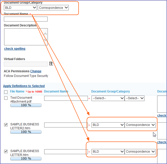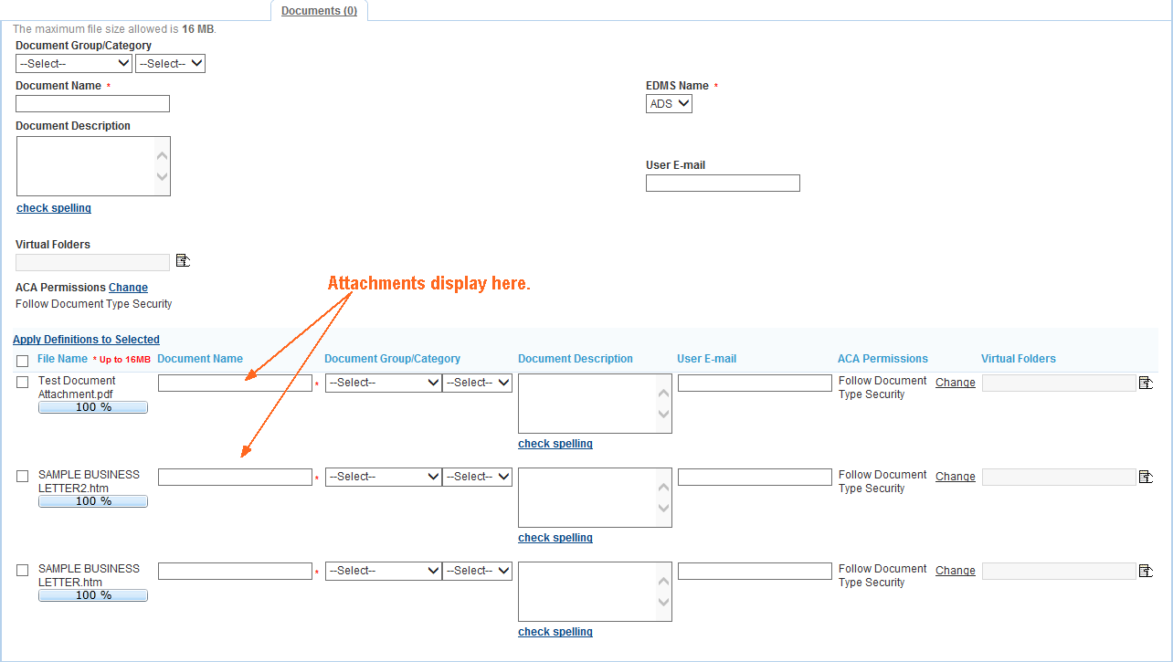 Set the attributes (for example, Document Group/Category or EDMS Name) you want to apply. For a list of the most common fields, see Attachment Fields.