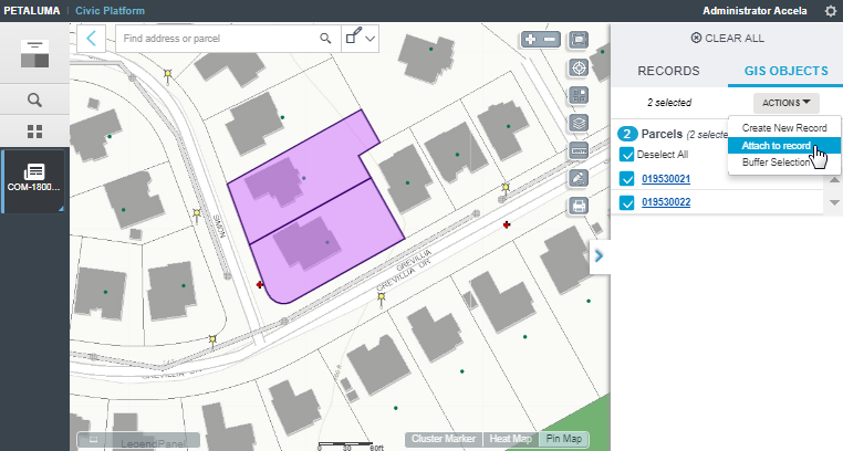 While working with records in Civic Platform, you can attach GIS objects to the current record. This allows anyone working with the record to geographically visualize the impact or extent of the transaction record within the agency’s jurisdiction. For example, a permit clerk can draw the exact location of a new property including the extent of its environmental impact. The geographic data enhances the transaction record and can help with facilitating efficient and effective transaction workflows.