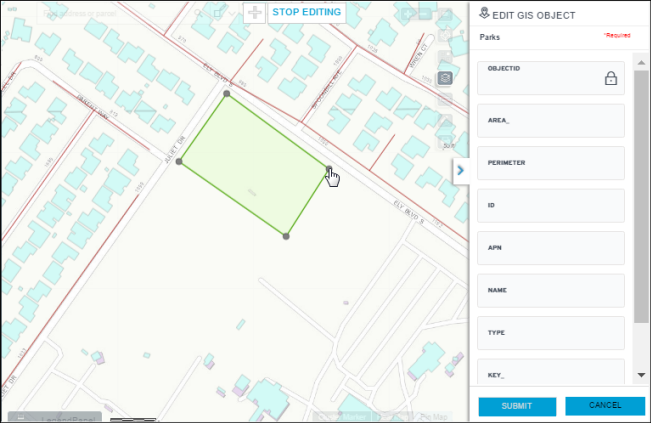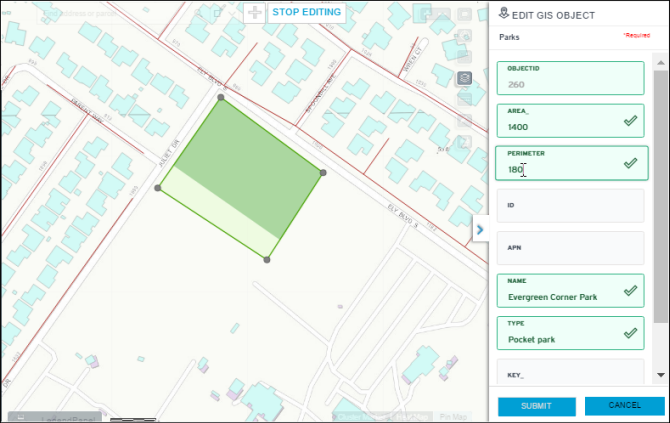 layer session and view the modified GIS object on the map, along with other mapNote: If STOP EDITING is clicked without submitting the last GIS object data entry or drawing, the user will be prompted to discard any changes or to resume the edit layer session.