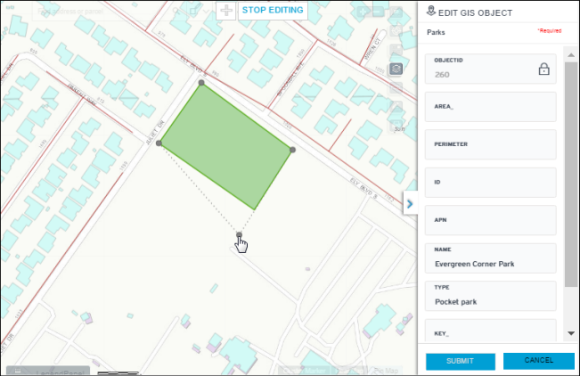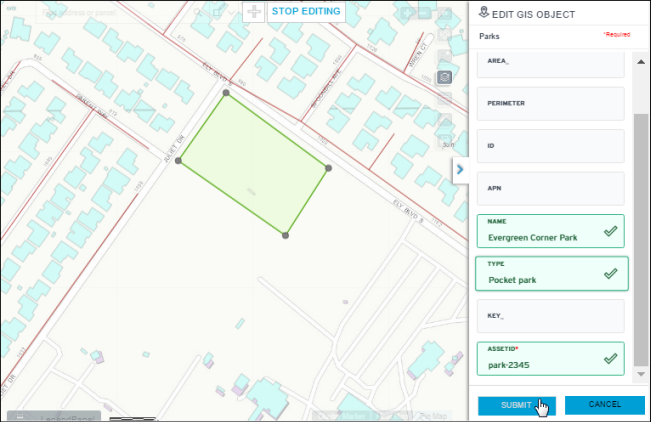 finishing a GIS object drawing and data entry, click Submit to save the