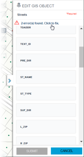 The Edit GIS Object panel validates required fields and data formats. A field entry that passes validation is highlighted as green, and a field entry that fails validation is highlighted as red. Multiple validation errors are listed at the top of the Edit GIS Object panel. The user can click an error message on the list to jump to the field with the validation error. The Submit button is disabled until all field entries are valid.-