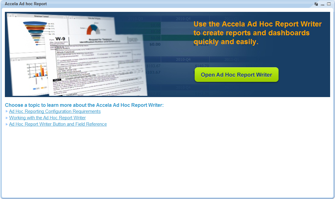 You can access the ad hoc report writer and ad hoc reports documentation from the Ad Hoc Report Writer landing page.
