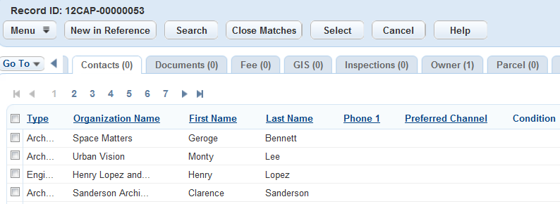 Note:You may have specified the contact type and type in the search criteria. However, Civic Platform ignores the type information when performing the search, because users can add reference contacts of any type to records in various roles (transaction contact types).