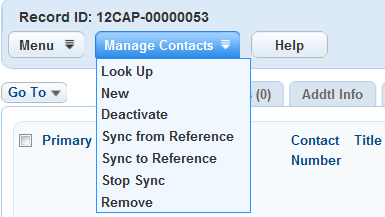 The Manage Contacts menu on the Contacts tab provides you with a list of actions that you can perform on one or more records. For example, you can look up contacts to add to a record, add a new contact, and synchronize record contacts with their reference source.