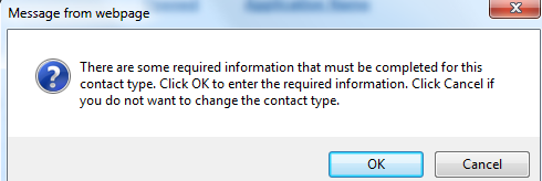 If Civic Platform requires template fields for the new contact type, Civic Platform prompts you to enter the required information. Click Yes to continue. and go to Edit any of the fields that display in the Contact Detail section. See Contact Detail for a list of field descriptions. to complete the required information.